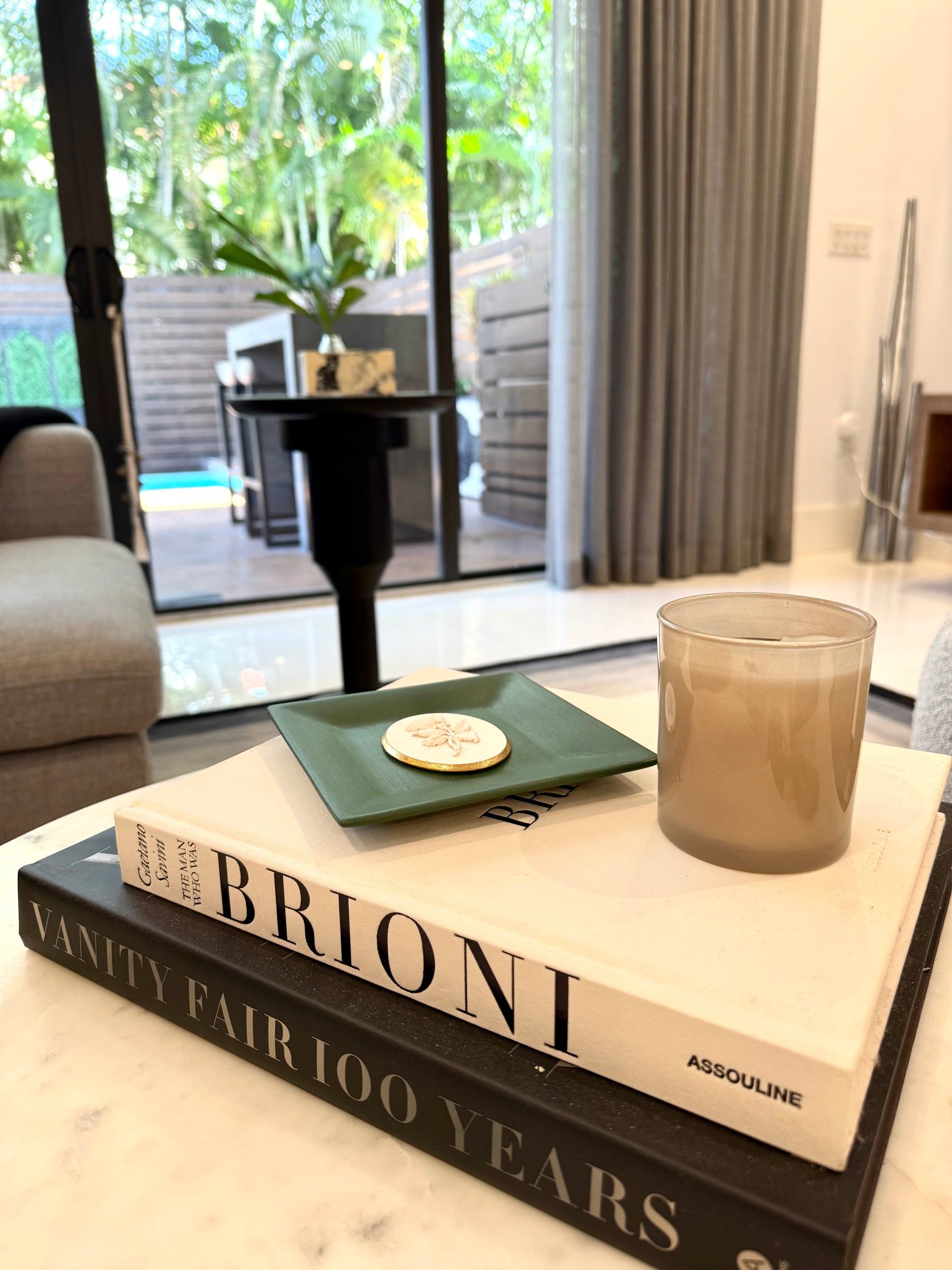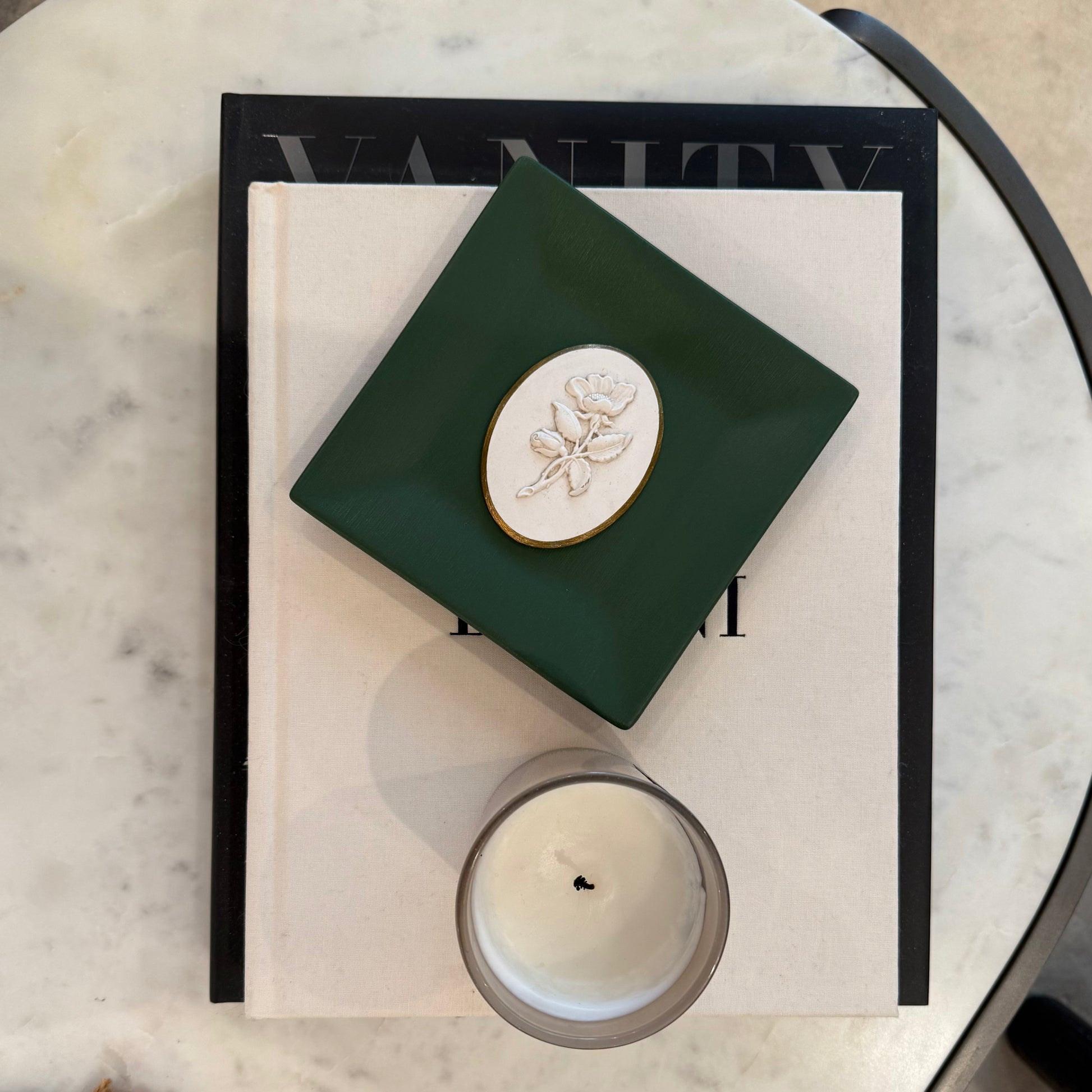 This handcrafted intaglio plate is part of the intaglio Collection - a curated series of symbolic impressions chosen for their quiet beauty and personal meaning. Elegant yet understated, this piece is designed to be styled on a shelf, console, coffee table, or displayed on a wall as part of a collected vignette. This particular intaglio showcases a beautiful flower intaglio on a green plate displayed on a gold stand (stand sold separately).
