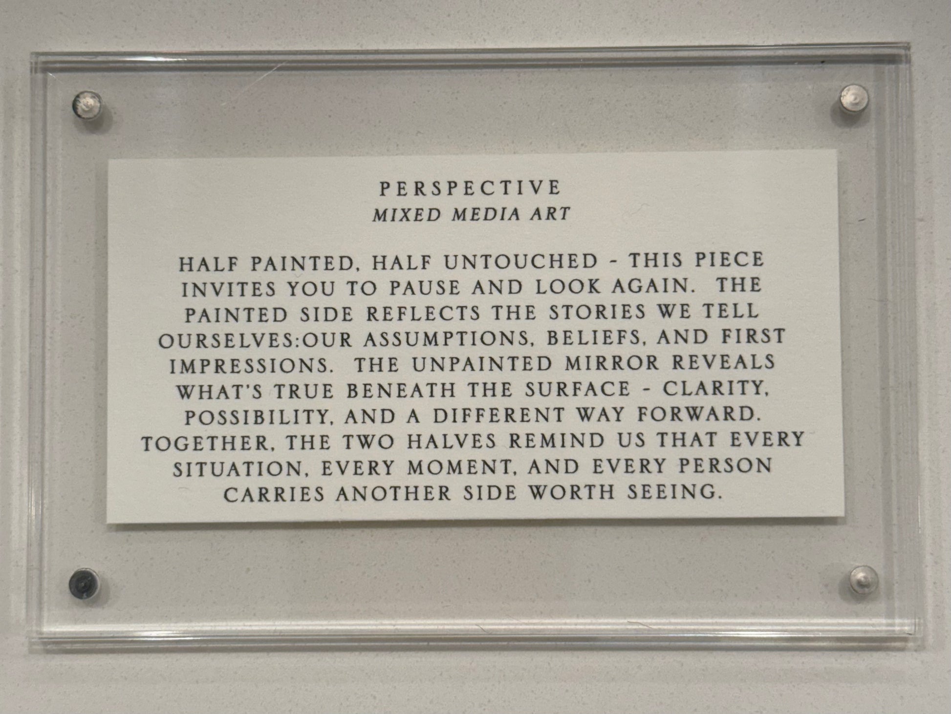 Half painted, half untouched - this piece invites you to pause and look again. The painted side reflects the stories we tell ourselves: our assumptions, beliefs, and first impressions. The unpainted mirror reveals what’s true beneath the surface- clarity, possibility, and a different way forward.